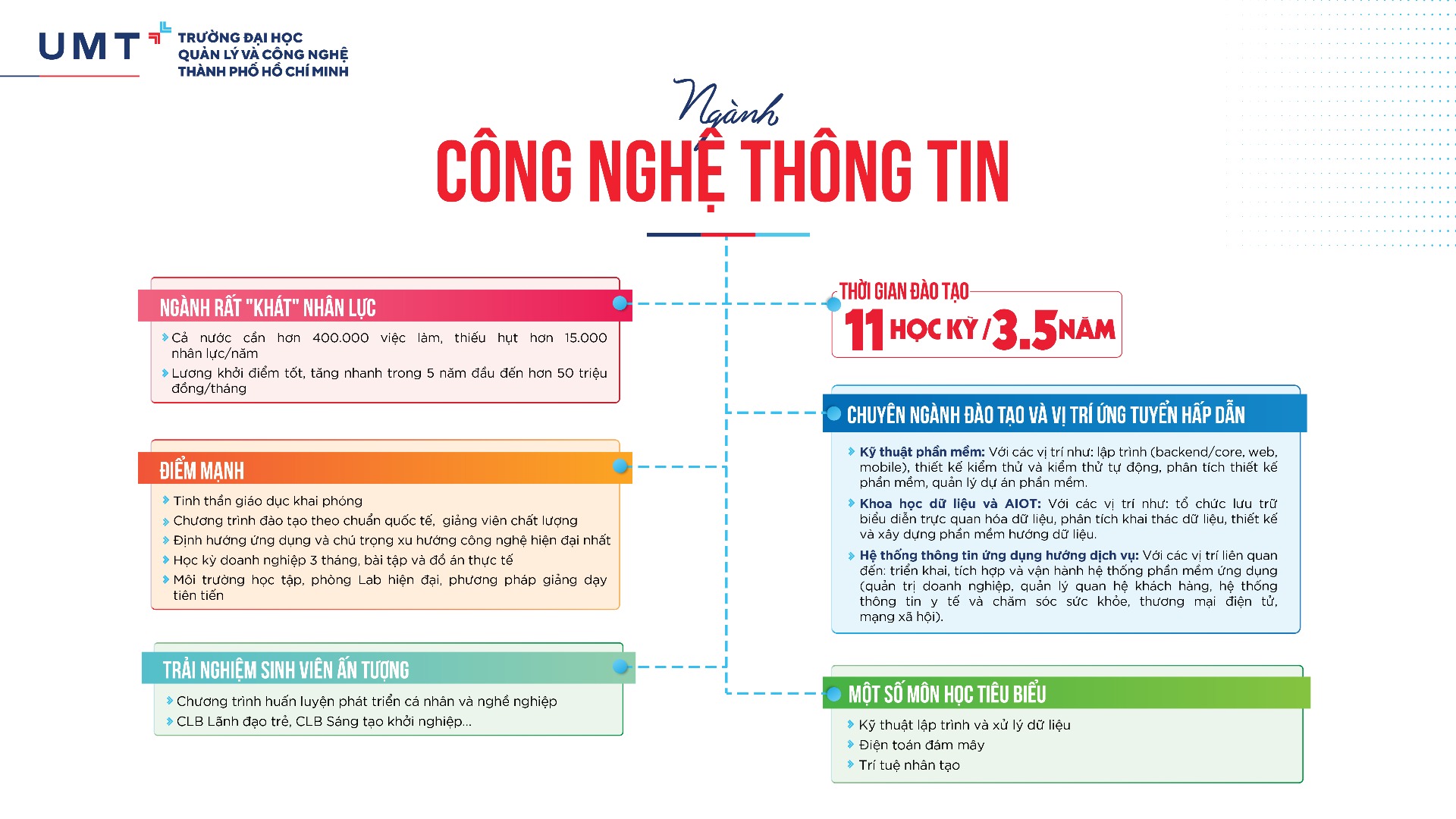 UMT's Information Technology training program is optimized for each student during the study process, ensuring accurate, successful, and best quality training; met the requirements for research, develop and apply information technology in practice. Students are trained in a modern educational foundation, a program adapted from leading universities in the world with liberal knowledge, soft skills, solid and outstanding specialized knowledge, creating added values for businesses.