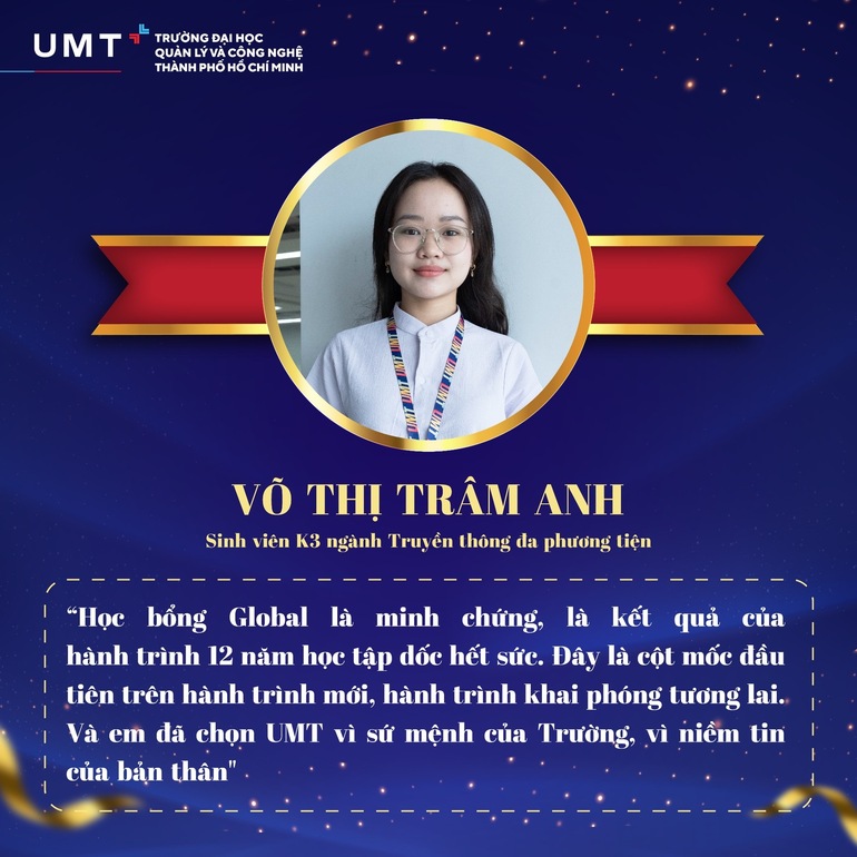 Học bổng Global là minh chứng, là kết quả của hành trình 12 năm học tập dốc hết sức và chính thức trở thành tân sinh viên ngành Truyền thông đa phương tiện. Đây là cột mốc đầu tiên trên hành trình mới, hành trình khai phóng tương lai. Và em đã chọn UMT vì sứ mệnh của Trường, vì niềm tin của bản thân.