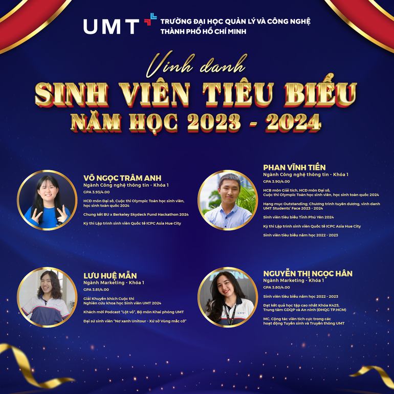 Trong năm học mới 2024 – 2025, UMT cũng hân hoan chào đón thế hệ sinh viên tiên phong kế tiếp vô cùng tài năng, năng động và sáng tạo ở 8 ngành đào tạo: Công nghệ thông tin, Truyền thông đa phương tiện, Thiết kế đồ họa, Logistics và Quản lý chuỗi cung ứng, Marketing, Quản trị kinh doanh, Kinh doanh quốc tế, Quản lý thể dục thể thao. Tân sinh viên nhận được học bổng đều là những bạn đạt thành tích cao trong kỳ thi học sinh giỏi các cấp, tham gia và đạt giải ở các cuộc thi - giải đấu cấp quốc gia trở lên, đạt điểm cao trong kỳ thi Tốt nghiệp THPT 2024, thành tích học tập xuất sắc, hoặc đạt thành tích cao trong các lĩnh vực Văn hóa - Nghệ thuật - Thể thao, tích cực trong các hoạt động cộng đồng, tham gia cuộc thi khởi nghiệp và nghiên cứu khoa học…