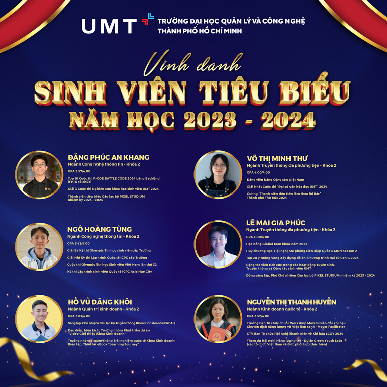 Năm học cũ đã khép lại với nhiều dấu ấn đặc biệt, trong đó những nỗ lực trong học tập và rèn luyện của các bạn sinh viên góp một phần không nhỏ vào những thành công đó. Với sự tích cực, tinh thần cầu tiến và sự cố gắng không ngừng, nhiều thành tích ấn tượng của UMTers đã tiếp tục được ghi danh vào bảng vàng thành tích UMT. Nhà trường đã xét chọn và tuyên dương 4 sinh viên Khóa 1 và 6 sinh viên Khóa 2 xuất sắc, gồm: