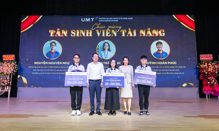 ThS. Huỳnh Thúy Phương - Phó Chủ tịch Hội đồng Trường, Phó Hiệu trưởng UMT cùng Ông Nguyễn Hoàng - Chủ tịch Tập đoàn N&G Group trao học bổng Global danh giá cho 3 tân sinh viên tài năng: Nguyễn Nguyên Ngự, Võ Thị Trâm Anh (ngành TTĐPT) và Huỳnh Hoàn Phúc (ngành CNTT).