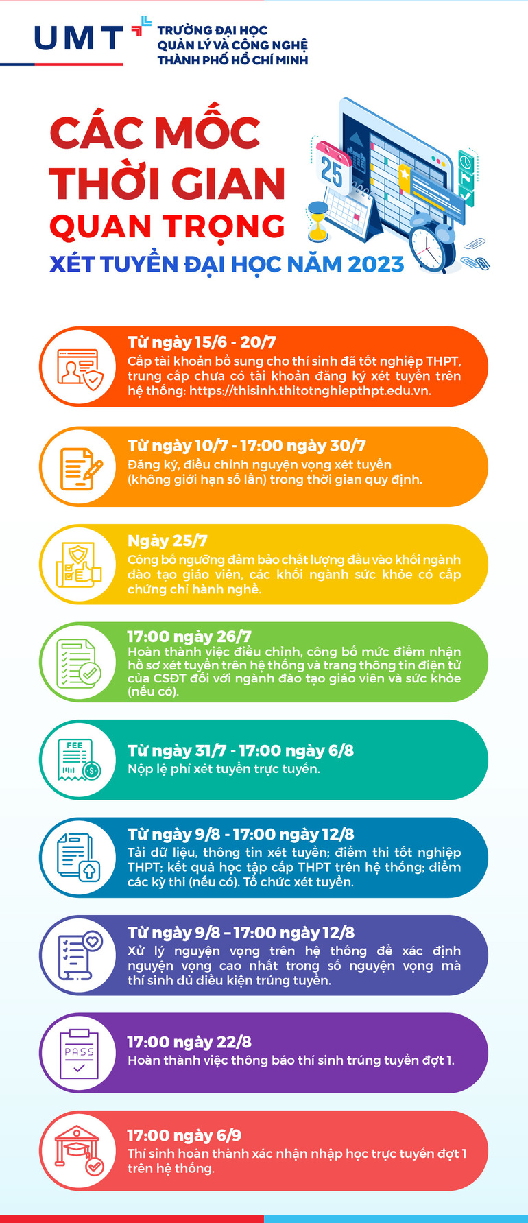 Tốt nghiệp THPT và xét tuyển vào đại học là cột mốc vô cùng quan trọng, quyết định tương lai của mỗi bạn học sinh. Do đó, để tránh những sai lầm đáng tiếc, UMT hy vọng các bạn học sinh lớp 12 năm nay cần nắm rõ các mốc thời gian quan trọng sau trong bài viết.