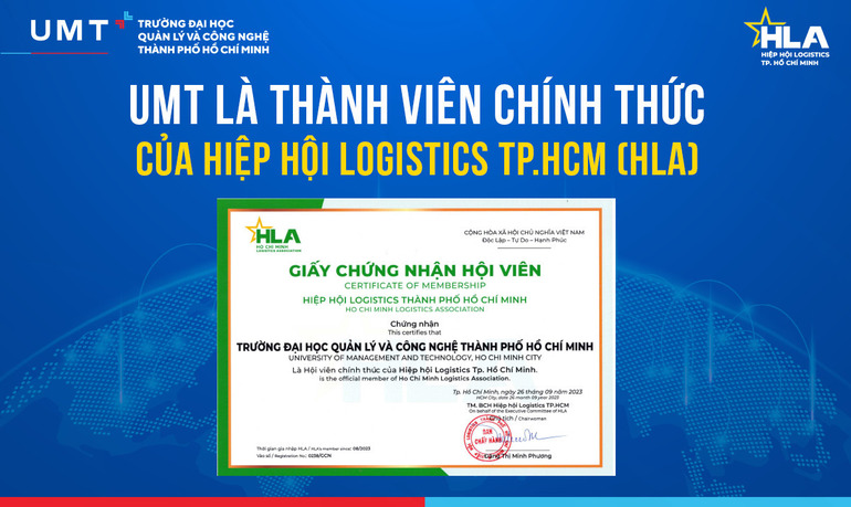 Trường Đại học UMT chính thức trở thành hội viên của Hiệp hội Logistics TP.HCM (HLA) vào tháng 8/2023. Đây là tiền đề để UMT mở rộng mối quan hệ với các đối tác, doanh nghiệp trong cộng đồng Logistics tại Việt Nam và thế giới.