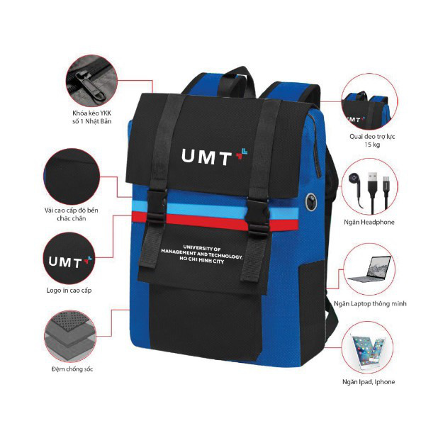 Phiên bản balo và nón bảo hiểm UMT là sản phẩm “signature” được thiết kế riêng chỉ dành cho UMTers, đáp ứng đầy đủ nhu cầu về mặt thẩm mỹ, công năng, độ bền và an toàn cho người sử dụng. Sản phẩm với màu xanh và màu đen chủ đạo tạo sự sang trọng, kết hợp cùng với các line xanh đỏ trẻ trung và hiện đại, logo UMT được thiết kế nổi bật và tinh tế, sẽ là lựa chọn đáng tin cậy để đồng hành cùng sinh viên suốt ngày dài năng động, giúp gia tăng sự tự tin để khẳng định “I am UMTer, I make tommorrow”. Từ đó, mỗi bạn sẽ là một đại sứ tuyệt vời cùng UMT bay cao, bay xa.