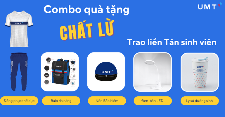 Chào mừng các Tân sinh viên khóa đầu tiên gia nhập vào đại gia đình UMT, ngôi nhà của thành công và hạnh phúc, Combo quà tặng “chất lừ” đã được chuẩn bị chu đáo dành cho UMTers, cùng với đó là thông điệp tích cực mà Nhà trường, Doanh nghiệp gửi gắm đến các bạn trẻ. Chúng ta cùng khám phá Combo quà tặng này có gì hấp dẫn nhé!