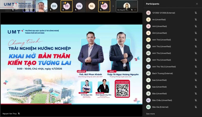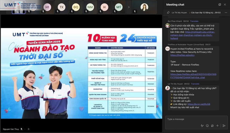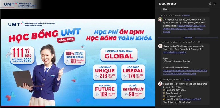 Thầy Tô Ngọc Hoàng Nguyên - Trưởng Phòng Tuyển sinh UMT, Host của Chương trình cũng mang đến thông tin hữu ích về học bổng UMT 2026, cơ hội tiếp cận môi trường giáo dục hiện đại, khai phóng cùng nhiều hỗ trợ tài chính thiết thực. Chương trình khép lại với phần giao lưu sôi nổi khi nhiều câu hỏi thiết thực từ các bạn học sinh đã được đặt ra. Trong đó, bạn Thiên Ngân bày tỏ sự quan tâm đến cơ hội việc làm trong bối cảnh sinh viên không chỉ cạnh tranh với sinh viên trường khác mà còn với sinh viên quốc tế.