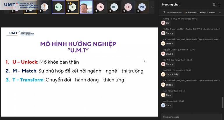 Mở đầu chương trình, ThS. Bùi Phan Khánh - Phó Trưởng Phòng Công tác sinh viên UMT, giới thiệu mô hình hướng nghiệp U-M-T, gồm ba bước cốt lõi: Unlock - Match - Transform. Thông qua những ví dụ gần gũi, Thầy nhấn mạnh tầm quan trọng của việc thấu hiểu bản thân, nhận diện điểm mạnh, giá trị và sở thích cá nhân của mỗi bạn học sinh. Từ đó, các bạn kết nối chúng với ngành học, nghề nghiệp và chuyển hóa định hướng thành lộ trình hành động cụ thể trong tương lai. Đây cũng là yếu tố quan trọng để giúp học sinh phát triển kỹ năng tự định hướng (một trong những năng lực thiết yếu của công dân thời đại số).