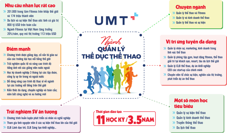 Bắt kịp xu hướng phát triển vượt bậc của ngành quản lý và kinh doanh trong lĩnh vực thể dục thể thao (TDTT) tại Việt Nam, chương trình đào tạo QLTDTT tại UMT được xây dựng với mục đích đào tạo đội ngũ các nhà khởi nghiệp sáng tạo, chuyên gia, quản lý cấp cao, chuyên viên tư vấn và vận hành kinh doanh chuyên nghiệp đạt chuẩn quốc tế trong ngành TDTT.