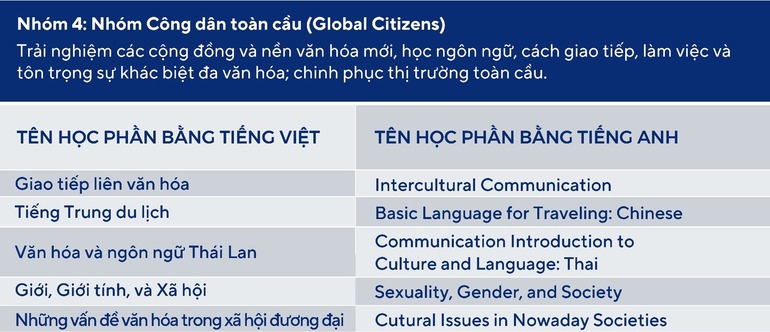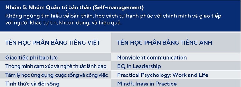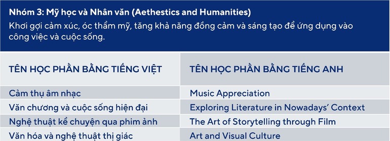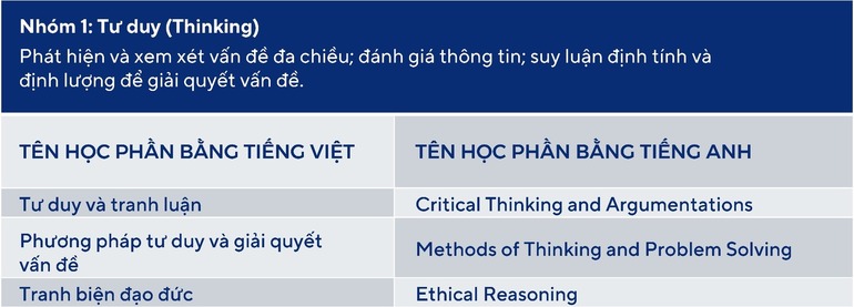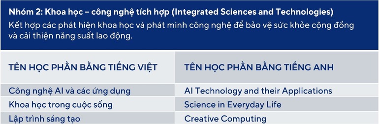 Ngay từ năm Nhất, sinh viên tiếp xúc với nền tảng tri thức tích hợp từ đa dạng lĩnh vực: khoa học, tư duy, mỹ học và nhân văn, quản trị bản thân, công dân toàn cầu và phát triển sự nghiệp. Qua đó, sinh viên khám phá những câu hỏi quan trọng của cuộc sống. Đồng thời, sinh viên được trao quyền để áp dụng kiến thức vào thực tiễn có chủ đích và thành thạo những kỹ năng thiết yếu.