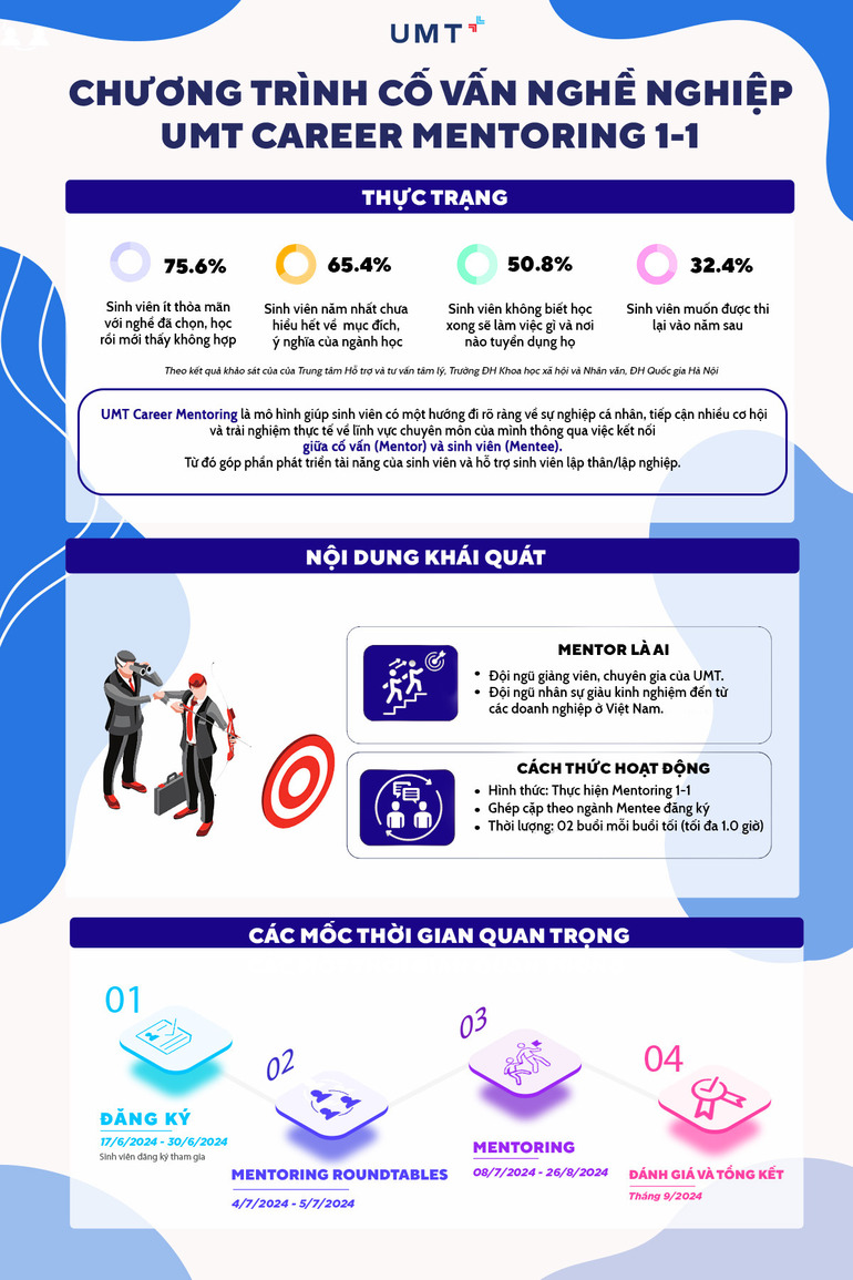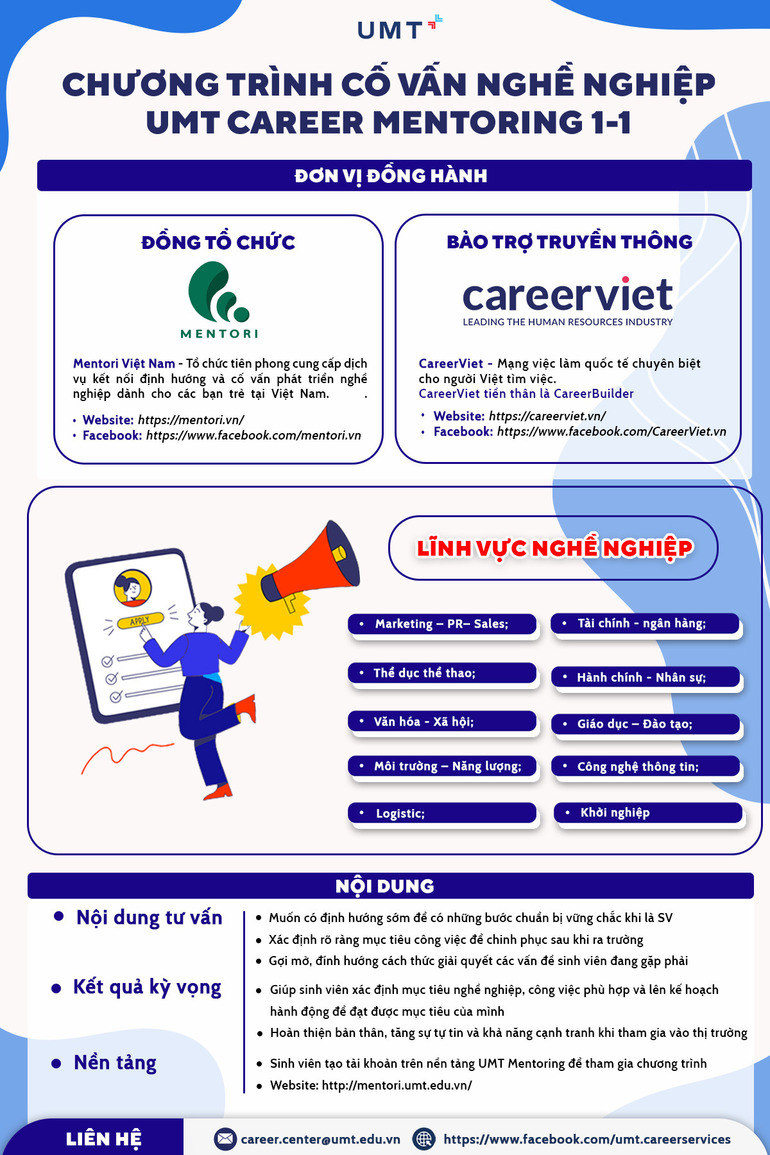 UMT CAREER MENTORING là chương trình được xây dựng dành riêng cho sinh viên UMT với mục đích giúp các bạn sinh viên có một định hướng rõ ràng về con đường nghề nghiệp của bản thân, tiếp cận nhiều cơ hội, môi trường trải nghiệm thực tế về ngành nghề của mình thông qua hoạt động kết nối Mentor (Cố vấn) - Mentee (Người được cố vấn).