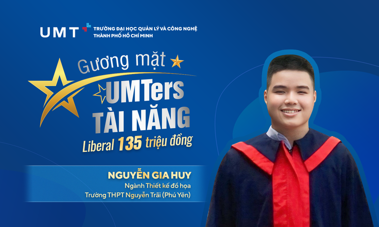 Bạn Nguyễn Gia Huy, Trường THPT Nguyễn Trãi (Phú Yên), khi nhận Học bổng toàn khóa Liberal 135 triệu đồng, ngành Thiết kế đồ họa từ UMT. Cùng điểm qua những thành tích trong học tập ấn tượng lẫn hoạt động phong trào của chàng trai này nhé:
