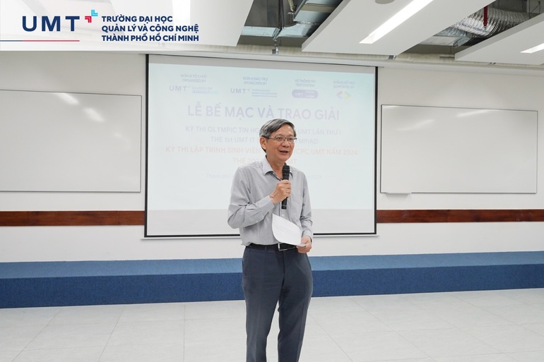 PGS. TS. Trần Đan Thư - Trưởng Ban Chỉ đạo Kỳ thi, đã gửi lời chào mừng và chia sẻ kỳ vọng lớn lao dành cho các thí sinh. Thầy nhấn mạnh rằng Kỳ thi Olympic Tin học và ICPC UMT là cơ hội để sinh viên khám phá, phát triển bản thân và biến ý tưởng sáng tạo thành hiện thực. Đây là một phần trong sứ mệnh của UMT, nhằm đào tạo nguồn nhân lực chất lượng cao cho ngành CNTT.