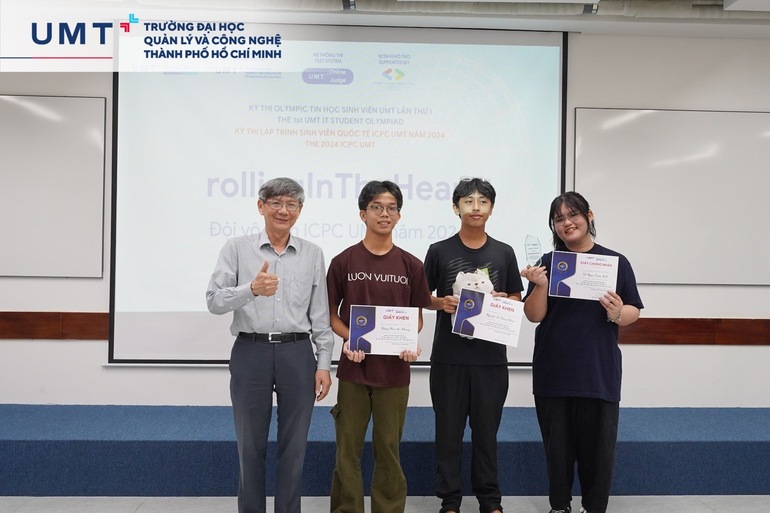 Ngày 9/10/2024, kỳ thi ICPC đã diễn ra với thời gian làm bài 300 phút, yêu cầu sự phối hợp ăn ý giữa các thành viên đội nhóm. Đội rollingInTheHeap (gồm 3 sinh viên ngành CNTT: Đặng Phúc An Khang K2, Võ Ngọc Trâm Anh K1, Nguyễn Lê Đăng Khoa K2) đã xuất sắc giành ngôi vị “Vô địch ICPC UMT 2024” nhờ khả năng giải quyết nhanh chóng và chính xác nhiều bài thi hóc búa.