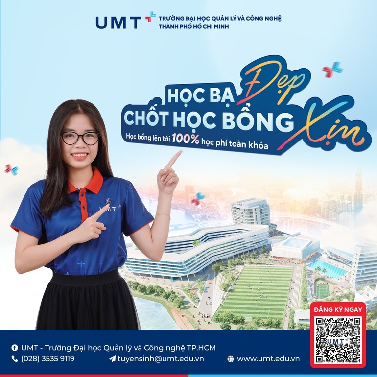 Với mong muốn đồng hành cùng thế hệ trẻ trên hành trình chinh phục tri thức, Trường Đại học Quản lý và Công nghệ TP.HCM (UMT) triển khai chương trình học bổng năm 2026 hơn 80 tỷ đồng và trị giá lên đến 100% học phí toàn khóa, dành cho thí sinh có thành tích học tập xuất sắc, nổi bật trong các lĩnh vực nghệ thuật, thể thao, nghiên cứu khoa học, hoạt động cộng đồng và hội nhập quốc tế.