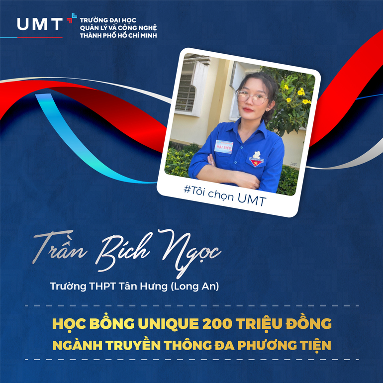 Với sở trường viết lách và niềm đam mê mãnh liệt dành cho văn chương, Bích Ngọc khát khao được sáng tạo bằng sức mạnh ngôn từ và mạnh dạn theo đuổi ngành Truyền thông đa phương tiện: “Với sở thích trải nghiệm hoạt động, tham gia câu lạc bộ năng động và sáng tạo, em nhận thấy bản thân rất phù hợp với nhóm ngành truyền thông. Em rất mong sau khi tốt nghiệp THPT sẽ trở thành một UMTer chính hiệu, được trải nghiệm cơ sở vật chất hiện đại, được gặp quý thầy cô có kinh nghiệm dày dặn… để có thể phát triển bản thân và tiếp tục con đường học tập năng động với ngành Truyền thông đa phương tiện. UMT sẽ là bệ phóng hoàn hảo để em cùng các bạn sinh viên thể hiện bản ngã cá nhân mà không bị ép buộc bởi bất kỳ rào cản vô hình nào”.