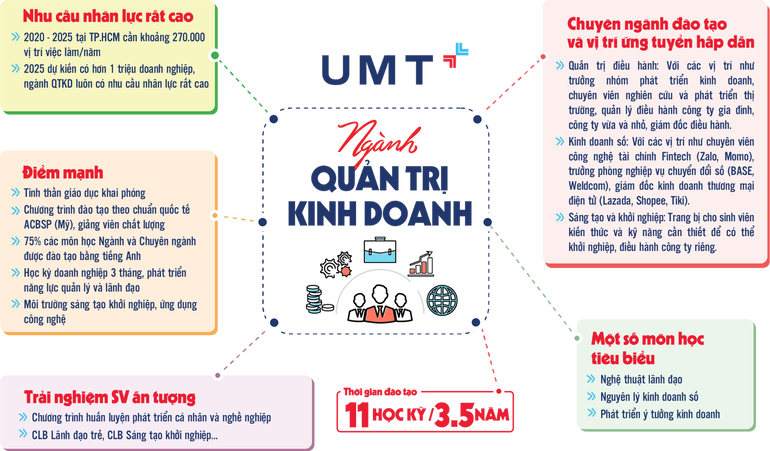 Ngành QTKD tại UMT định hướng đào tạo đội ngũ các nhà sáng tạo khởi nghiệp, nhà quản lý điều hành doanh nghiệp cao cấp. Nhà trường trang bị đầy đủ cho sinh viên khối kiến thức, tư duy liên quan đến khởi nghiệp, quản trị thương hiệu, thiết lập và triển khai các mô hình kinh doanh cũng như kỹ năng cần thiết trong bối cảnh kinh tế và xu hướng 4.0 hiện nay như: kinh doanh số, quản trị sự thay đổi, kỹ năng gây quỹ...