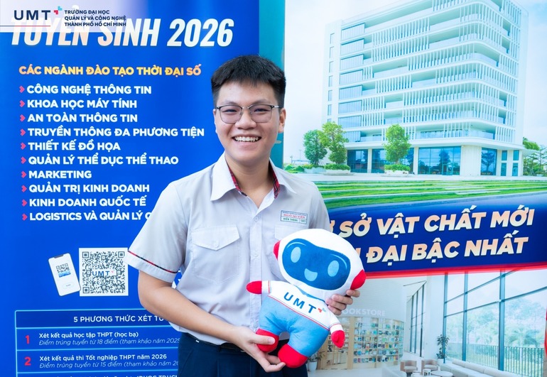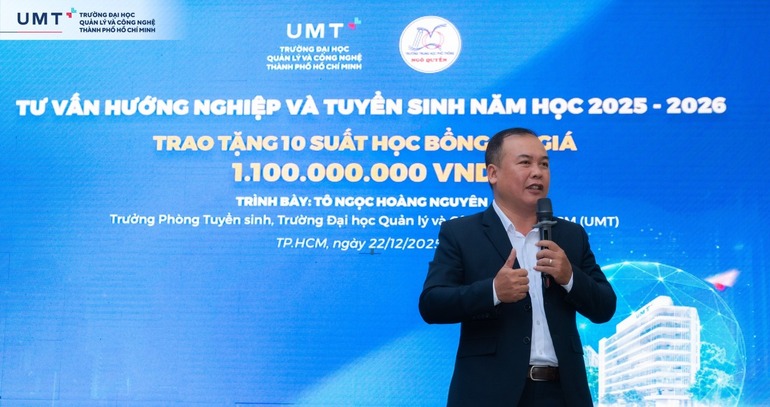 Tại chương trình, Thầy Tô Ngọc Hoàng Nguyên - Trưởng Phòng Tuyển sinh UMT, đã chia sẻ về các ngành đào tạo mũi nhọn, chính sách học bổng lên đến 100% học phí toàn khóa, cùng môi trường học tập hiện đại, chuẩn quốc tế tại UMT.