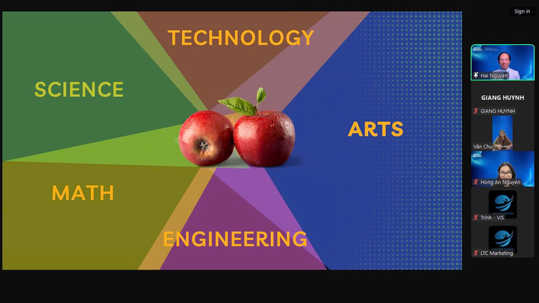 Một phần thú vị của Webinar là cách Thầy giải thích vai trò của STEAM qua ví dụ về quả táo, minh họa cho sự kết nối và bổ trợ lẫn nhau giữa các lĩnh vực. Trong Khoa học (Science), quả táo có thể được nghiên cứu về mặt sinh học, từ cấu trúc tế bào đến quá trình phát triển và chất dinh dưỡng bên trong. Về Công nghệ (Technology), quả táo có thể được phân tích chất lượng thông qua hình ảnh số hóa hoặc công nghệ bảo quản tiên tiến giúp kéo dài thời gian sử dụng. Đối với Kỹ thuật (Engineering), công cụ và máy móc được thiết kế để thu hoạch, bảo quản và xử lý quả táo một cách hiệu quả nhất. Nghệ thuật (Arts) xem quả táo như một nguồn cảm hứng sáng tạo, từ minh họa hình ảnh đến nghệ thuật sắp đặt hoặc nhiếp ảnh. Cuối cùng, trong Toán học (Mathematics), các yếu tố như kích thước, hình dáng, khối lượng và số lượng táo có thể được tính toán để tối ưu hóa quy trình sản xuất và phân phối. Qua lăng kính của STEAM, người học không chỉ học kiến thức chuyên môn mà còn phát triển tư duy đa chiều và khả năng giải quyết vấn đề.