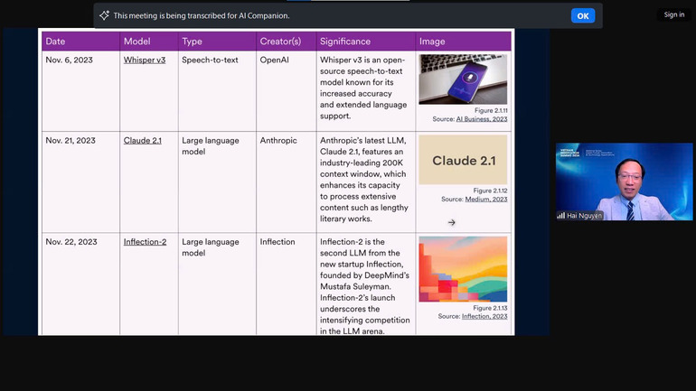 Trong buổi Webinar, TS. Nguyễn Thành Hải đã giới thiệu các mô hình AI tiên tiến ra mắt năm 2023, nổi bật là: Llama 2 của Meta; DALL-E 3 của OpenAI; SynthID của Google DeepMind; Mistral 7B, Ernie 4.0 của Baidu; GPT-4 Turbo và Whisper v3 của OpenAI... Mỗi mô hình đều mang lại cải tiến đáng kể trong các lĩnh vực khác nhau như xử lý ngôn ngữ, tạo hình ảnh, watermarking và nhận diện giọng nói. Những công nghệ này không chỉ giúp tối ưu hóa các ứng dụng AI hiện tại mà còn mở ra nhiều cơ hội mới cho giáo dục, hỗ trợ việc tạo ra nội dung giảng dạy thông minh, tự động hóa các nhiệm vụ hành chính và cung cấp phản hồi thời gian thực cho học sinh, góp phần nâng cao trải nghiệm học tập toàn diện.