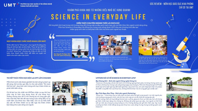 Bạn Hoàng Anh - Sinh viên ngành Công nghệ thông tin: “Science in Everyday Life một hành trình không ngừng khám phá, mở rộng những cánh cửa tri thức về khoa học trong cuộc sống hàng ngày của chúng ta. Mỗi môn Khai phóng ở UMT đều khiến bạn đi từ bất ngờ này đến bất ngờ khác. Qua môn học,em cảm thấy bản thân như được đưa đến vùng đất mới của khoa học, không hề khô khan mà vô cùng gần gũi và đặc sắc”.