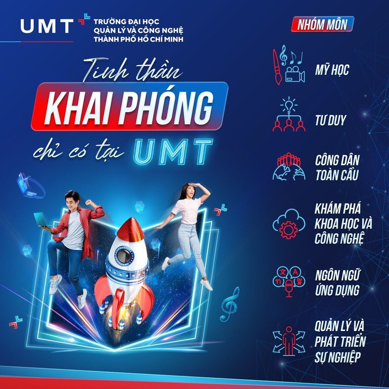 Tại UMT, chương trình giáo dục khai phóng cung cấp nền tảng kiến thức liên ngành ở 6 nhóm môn học đầy thú vị, mang tính khám phá. Sinh viên có cơ hội được học những môn mà các bạn có thể chưa từng tiếp xúc hoặc thậm chí cho rằng mình không phù hợp với lĩnh vực này trước đó như Ngôn ngữ, Âm nhạc, Mỹ học, Giao tiếp, Tư duy tranh luận, Văn hóa kinh doanh…