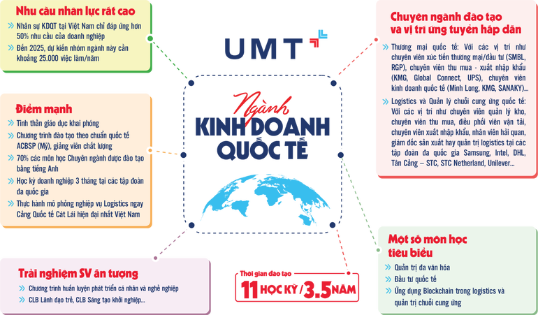 Theo thông tin mới nhất mà UMT được biết, nhu cầu tuyển dụng cả nước với nhóm ngành Kinh tế - Quản trị - Marketing - Xuất Nhập khẩu - Logistics chiếm khoảng 40% tổng nhu cầu tuyển dụng. Đến 2025, dự kiến nhóm ngành này cần khoảng 25.000 việc làm/năm. Nhân sự chuyên về KDQT tại Việt Nam chỉ mới đáp ứng hơn 50% nhu cầu của doanh nghiệp…