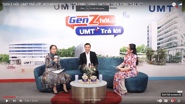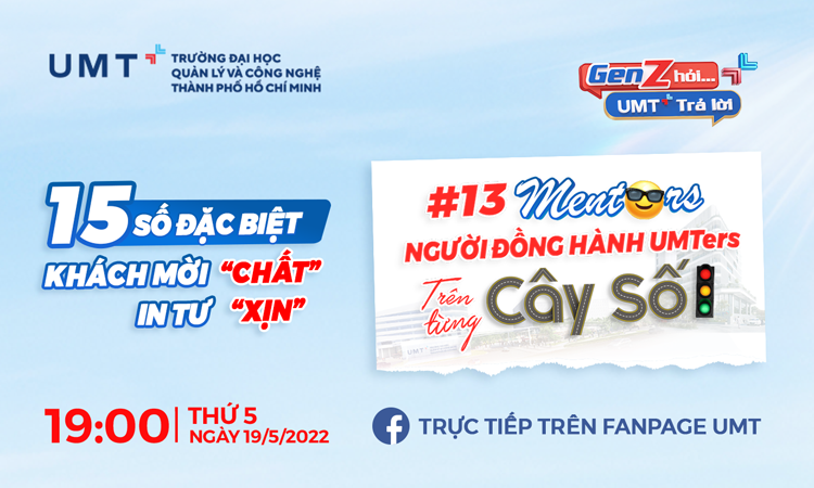 Chương trình “GEN Z HỎI – UMT TRẢ LỜI” # 13: Mentors - Người đồng hành UMTers trên từng “cây số” giúp quý phụ huynh và các bạn học sinh cùng UMT gỡ rối “tơ lòng” khi đang lo lắng chuẩn bị bước chân vào giảng đường đại học phải “tự thân, tự học”, điều gì cũng mới. Chương trình có sự tham gia của 2 khách mời: ThS. Nguyễn Đỗ Thanh Hà - Trưởng phòng CTSV, Giám đốc TT Dịch vụ Sinh viên, Trường Đại học UMT, cùng anh Trần Tiến Công - Nhà sáng lập Vietnam Coaching Institute (Học viện Đào tạo Coach Việt Nam).
