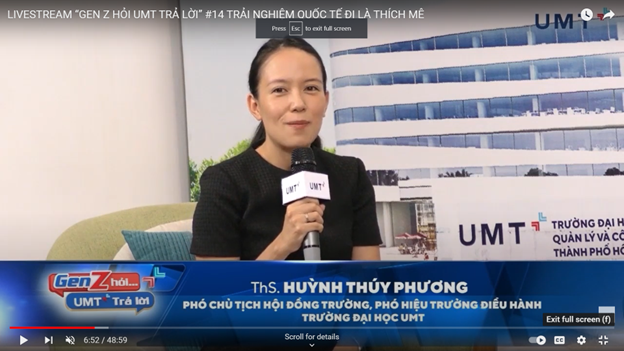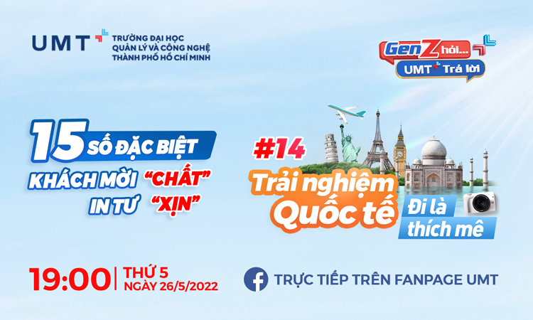 Trải nghiệm quốc tế có nhất thiết phải đi du học không? Tại UMT, sinh viên có thể trải nghiệm quốc tế như thế nào? Chương trình “GEN Z HỎI – UMT TRẢ LỜI” # 14 lần này với chủ đề Trải nghiệm quốc tế, đi là thích mê có sự tham gia của các khách mời: ThS. Huỳnh Thúy Phương - Phó Chủ tịch Hội đồng Trường, Phó Hiệu trưởng Trường Đại học UMT; Anh Huỳnh Công Thắng - Nhà sáng lập kiêm CEO InnoLab.Asia, Nhà sáng lập Tổ chức Giáo dục Lead The Change và điều hành dự án huy động vốn cộng đồng Give it back; Chị Hoàng Thị Mỹ Linh - Giám đốc Điều hành Tổ chức Giáo dục Lead The Change.