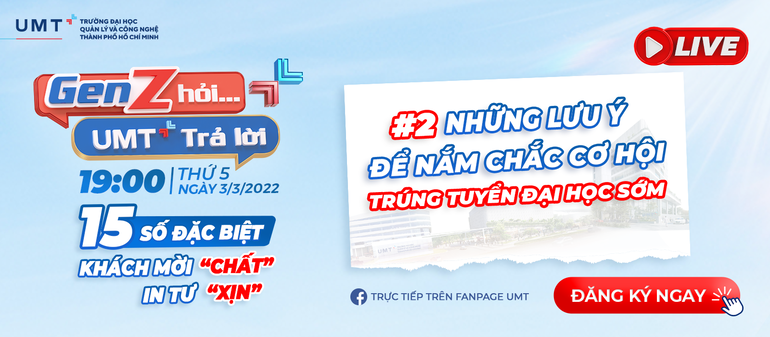 Chương trình do Trường Đại học Quản lý và Công nghệ TP.HCM (UMT) tổ chức định kỳ vào lúc 19:00, thứ 5 hàng tuần trên kênh Fanpage UMT. Trân trọng kính mời Quý phụ huynh và các em học sinh đón xem!