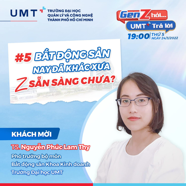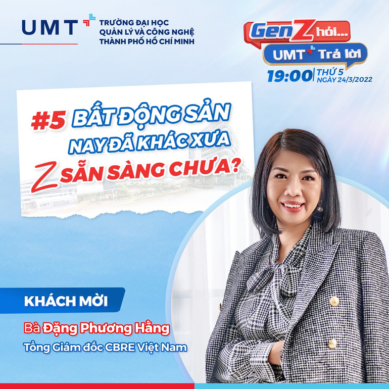 “GEN Z HỎI – UMT TRẢ LỜI”, chủ đề số 5: Bất động sản nay đã khác xưa, Z sẵn sàng chưa? với sự tham dự của 2 nhân vật đặc biệt: Bà Đặng Phương Hằng – Tổng Giám đốc Công ty TNHH CBRE (Việt Nam) và TS. Nguyễn Phúc Lam Thy – Phó trưởng Bộ môn Bất động sản, Khoa Kinh doanh, Trường Đại học UMT.