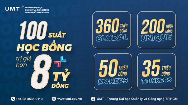Năm 2022, Trường Đại học UMT dành 100 suất học bổng có giá trị từ 35 triệu đồng (1 năm) đến 360 triệu đồng (học bổng toàn phần) thuộc 4 loại: Global, Unique, Makers và Thinkers. Mỗi học bổng dành cho từng đối tượng và điều kiện dự tuyển khác nhau, thí sinh có thể theo dõi thêm tại link này: https://tuyensinh.umt.edu.vn/vi-vn/hoc-bong-va-ho-tro-tai-chinh.html. Việc tìm hiểu kỹ về đối tượng, chính sách, điều kiện dự tuyển của học bổng sẽ giúp bạn có thể lựa chọn gói học bổng phù hợp với bản thân nhất và có khả năng trúng tuyển cao nhất.