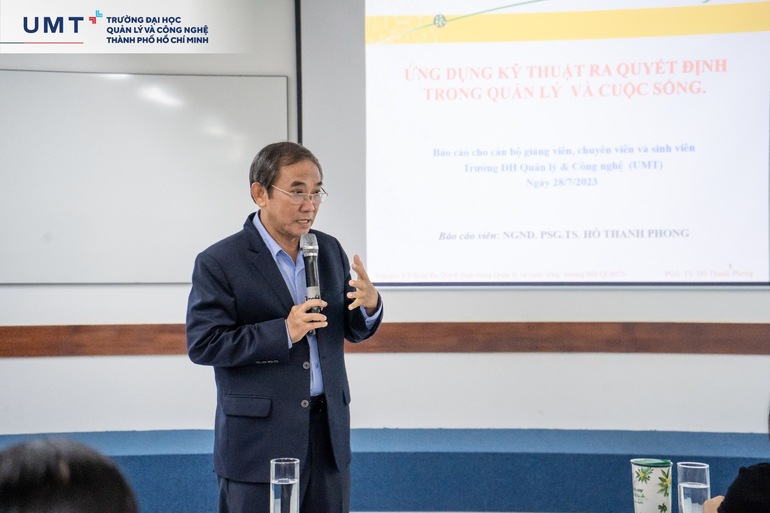 Sáng ngày 27/7/2023, NGND. PGS. TS. Hồ Thanh Phong - Phó Hiệu trưởng Phụ trách Đào tạo UMT đã tổ chức buổi báo cáo chuyên đề về “Ứng dụng kỹ thuật ra quyết định trong quản lý và cuộc sống” cho GVNV và sinh viên UMT.