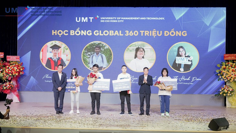Trường Đại học Quản lý và Công nghệ TPHCM (UMT) dành 100 suất học bổng cho tân sinh viên với tổng giá trị hơn 8 tỷ đồng. Trong đó có các gói học bổng toàn khóa trị giá 360 triệu đồng, 200 triệu đồng và các gói học bổng cho năm học đầu tiên trị giá 50 triệu đồng, 35 triệu đồng. Nhân dịp khai giảng vừa qua, trường đã trao bốn học bổng toàn khóa trị giá 360 triệu đồng/phần cho bốn sinh viên xuất sắc.