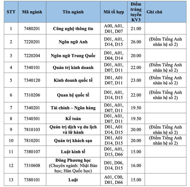 Điểm trúng tuyển nói trên là tổng điểm thi của 3 môn thi/bài thi trong tổ hợp xét tuyển, không nhân hệ số (trừ ngành Ngôn ngữ Anh), được làm tròn đến hai chữ số thập phân, không có bài thi/môn thi nào trong tổ hợp xét tuyển có kết quả từ 1,0 điểm trở xuống.