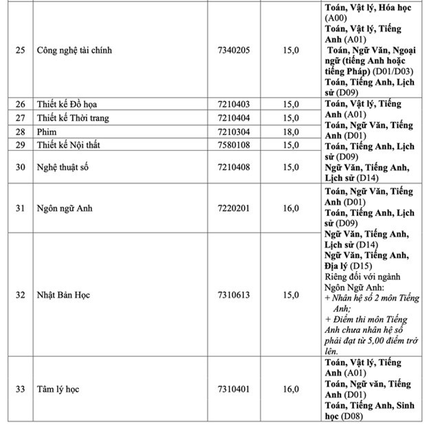 + Đối với những ngành có tổ hợp không có môn hệ số: