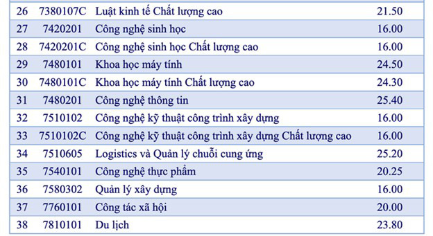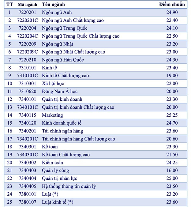 (*) Điểm trúng tuyển ngành Luật, Luật kinh tế: tổ hợp Văn, Sử, Địa (C00) cao hơn 1.5 điểm.