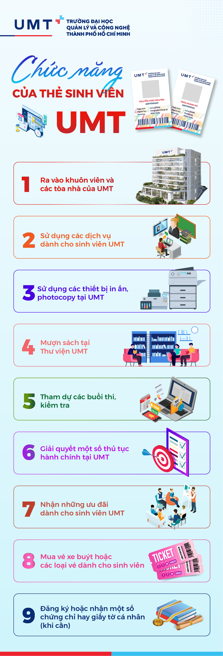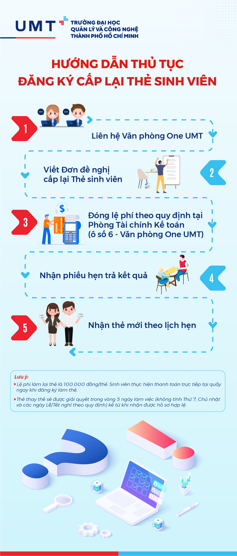 7. Khi có bất kỳ vấn đề gì liên quan đến Thẻ sinh viên, sinh viên nhanh chóng liên hệ Văn phòng One UMT hoặc email umt.hub@umt.edu.vn để được hỗ trợ.