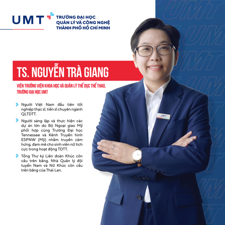 TS. Nguyễn Trà Giang, Viện trưởng Viện Khoa học và Quản lý Thể dục thể Thao UMT cho biết: “Chương trình đào tạo ngành Quản lý TDTT chủ yếu tập trung vào chất lượng kiến thức, kỹ năng thực tế trong quá trình học tập tại trường. Đặc biệt, trường tập trung đầu tư xây dựng những khóa học kỳ doanh nghiệp tại các tập đoàn, công ty lớn và uy tín trong lĩnh vực TDTT tại Việt Nam và thế giới. Với sự ưu tiên cho thực hành thực tế mới mẻ, thiết thực, chắc chắn sinh viên sẽ có đầy đủ kinh nghiệm, kiến thức, kỹ năng làm việc thực chiến cùng khả năng tiếng Anh lưu loát, tự tin nắm bắt nhiều cơ hội việc làm tốt sau khi tốt nghiệp tại UMT. Và tôi – TS. Nguyễn Trà Giang muốn trở thành người hướng dẫn các bạn sinh viên ngành Quản lý TDTT, cùng các bạn đi đến thành công và hạnh phúc”.