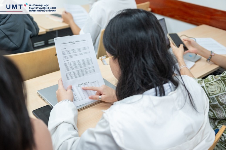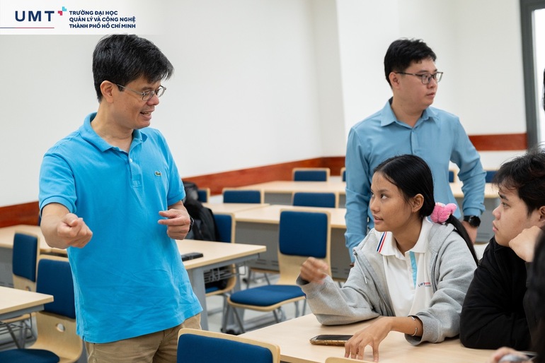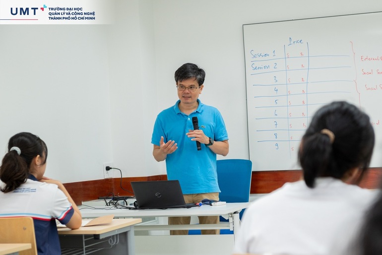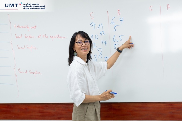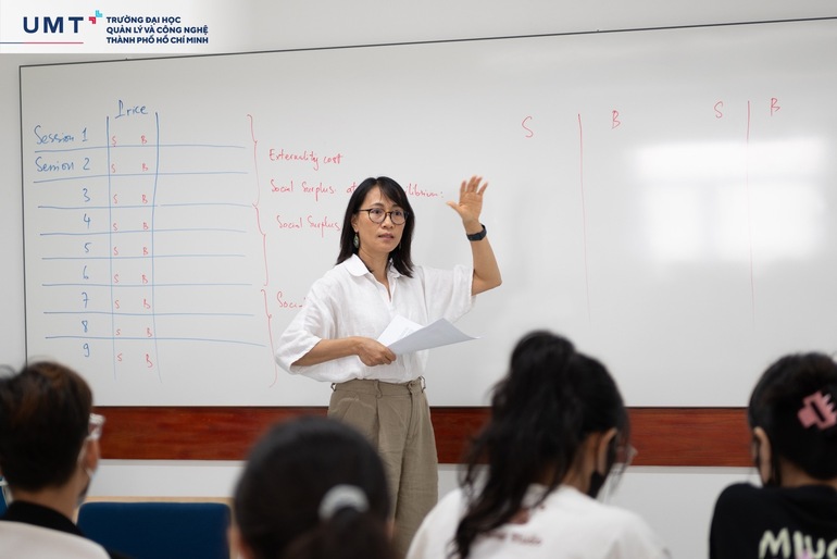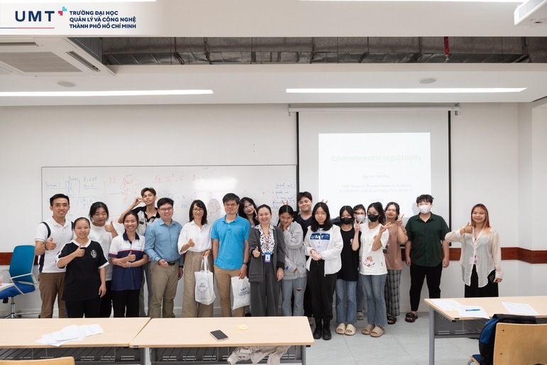 Hơn nữa, GS. Nguyễn Văn Phú còn giới thiệu giấy phép về Quyền gây ô nhiễm được đề xuất bởi Ronald Coase, minh họa cách doanh nghiệp có thể mua bán quyền gây ô nhiễm để đạt được sự cân bằng tối ưu trên thị trường. Từ những kiến thức cơ bản này, sinh viên UMT đã được trang bị cái nhìn toàn diện về cách các chính sách có thể tác động đến hành vi kinh tế và bảo vệ môi trường.