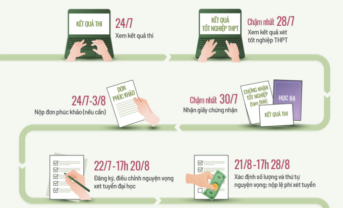 Sau thời gian trên, từ ngày 21/8 đến 17h ngày 28/8, thí sinh phải vào hệ thống của Bộ để xác nhận số lượng, thứ tự nguyện vọng và nộp lệ phí xét tuyển theo số lượng nguyện vọng đã đăng ký. Mọi bước được thực hiện trực tuyến.