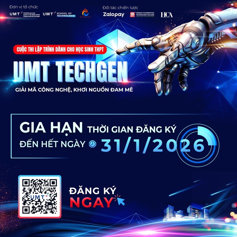Nhằm tạo thêm cơ hội để học sinh có thời gian tìm hiểu và chuẩn bị tốt hơn, Trường Đại học Quản lý và Công nghệ TP.HCM (UMT) chính thức gia hạn thời gian đăng ký cuộc thi UMT TechGen.
