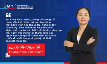 "Tại Khoa Kinh Doanh, chúng tôi không chỉ mang đến kiến thức, mà còn tạo dựng một hành trình học tập và trải nghiệm đầy cảm hứng. Sinh viên được khuyến khích khám phá, tìm tòi và phát triển tư duy sáng tạo mỗi ngày. Với chúng tôi, thành công không chỉ là đích đến, mà còn là thước đo chất lượng và giá trị mà UMT cam kết mang lại."