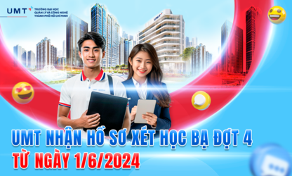 Trường Đại học UMT tiếp tục mở cổng xét tuyển đợt 4 dành cho những thí sinh lựa chọn phương thức xét điểm học bạ THPT, điểm thi ĐGNL (ĐHQG TP.HCM), thời gian xét tuyển bắt đầu từ ngày 1/6/2024 đến hết ngày 5/7/2024.