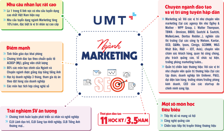 Ngành Marketing tại UMT tập trung đào tạo 2 chuyên ngành chính: Marketing số (Digital Marketing) và Quản trị chiến lược thương hiệu.