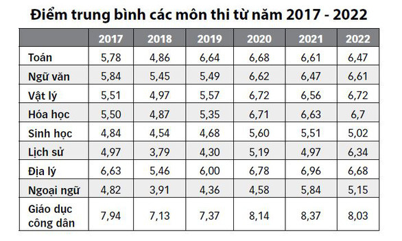 Năm 2022 là năm đầu tiên mà điểm trung bình tất cả các môn thi đều đạt mức trên 5,0. Điểm trung bình của năm môn thi toán, sinh, địa lý, ngoại ngữ, giáo dục công dân giảm nhẹ, trong đó môn sinh lần đầu tiên giữ vị trí đội sổ thay cho môn sử và môn ngoại ngữ.
