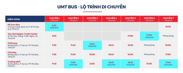 Hồ Con Rùa (Công trường Quốc tế) -> đường Phạm Ngọc Thạch -> rẽ trái vào đường Lê Duẩn -> rẽ phải vào đường Tôn Đức Thắng (dừng tại 37 Tôn Đức Thắng) -> đi thẳng qua cầu Ba Son -> rẽ phải vào đường Tố Hữu -> rẽ trái vào đường Mai Chí Thọ -> rẽ phải vào đường Trần Quý Kiên -> đi thẳng qua cầu Thời Đại -> rẽ trái vào đường Tạ Hiện -> rẽ phải vào đường Trương Văn Bang -> rẽ trái vào đường Phan Văn Đáng (dừng tại trạm xe bus D4, 99, ngay chung cư Vista Verde nếu có) -> rẽ phải vào đường Đồng Văn Cống -> đi thẳng đường Nguyễn Thị Định -> rẽ trái vào Khu đô thị Cát Lái (dừng đón tại đầu đường nếu có, Citihome – My Market và Citisoho – Nhà sách Hana) -> Trường UMT.
