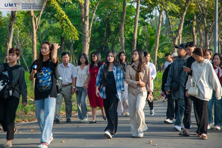 Một buổi sáng trong lành, đoàn học sinh đã tham quan toàn diện khuôn viên UMT với không gian xanh, hiện đại và giàu tính trải nghiệm. Các bạn tìm hiểu hệ sinh thái thể thao đặc trưng của Nhà trường với cụm sân Pickleball, cụm sân bóng đá đạt chuẩn, đồng thời trải nghiệm sinh hoạt tại căn tin sinh viên. Tiếp đó, đoàn di chuyển vào Tòa nhà Sáng tạo, sảnh trung tâm, thư viện, phòng tự học, các phòng ban hỗ trợ sinh viên và dừng chân tại tầng 8 để check-in với “view triệu đô” hướng Cảng Cát Lái - một trong những điểm nhấn đặc biệt của campus UMT.