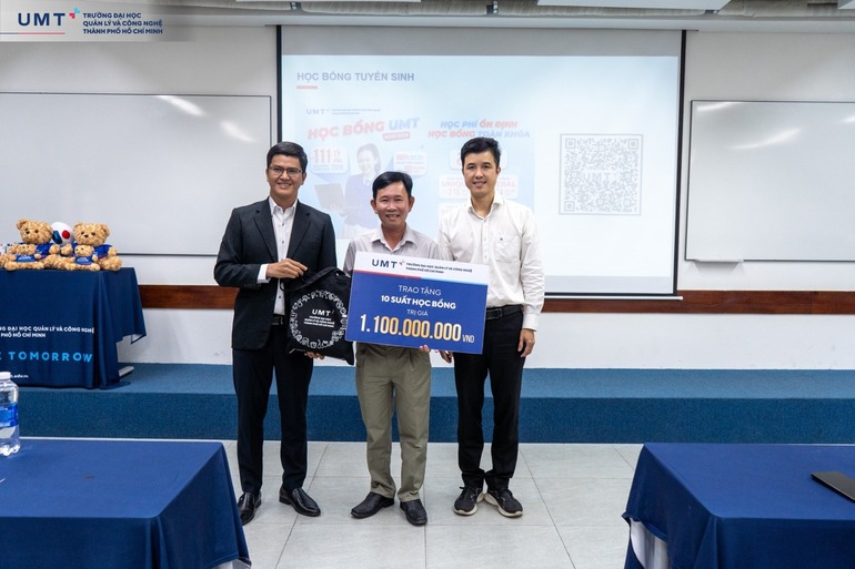 Điểm nhấn nổi bật của chương trình là hoạt động trao học bổng dành cho học sinh Mỹ Tú. TS. Phạm Văn Huy - Phó Trưởng Khoa Công nghệ UMT, đại diện Nhà trường trao tặng 10 suất học bổng Future, mỗi suất trị giá 110.000.000 đồng, thể hiện sự đồng hành và cam kết hỗ trợ học sinh trong hành trình tiếp cận môi trường giáo dục đại học chất lượng.