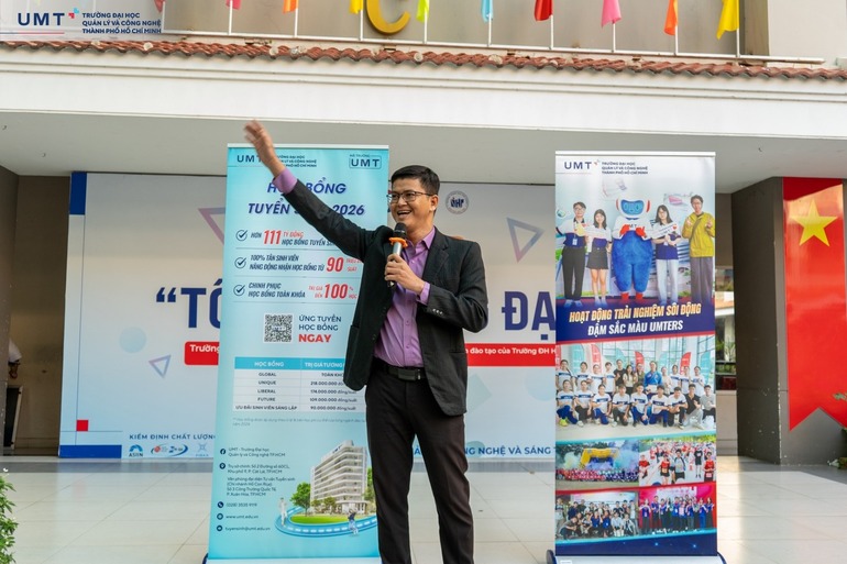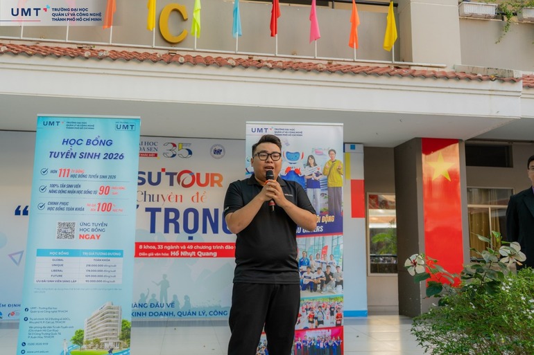 Vừa qua, UMT có cơ hội được đồng hành cùng Chuyên đề Hướng nghiệp dành cho học sinh Trường THPT Nguyễn Hữu Thọ (TP.HCM). Với không khí sôi động và hào hứng của Chương trình, TS. Chu Chung Cang – Trưởng Bộ môn Quản lý thể dục thể thao UMT, đã mang đến góc nhìn mới mẻ về ngành Quản lý thể dục thể thao (QLTDTT), phá vỡ định kiến cho rằng thể thao chỉ dành cho vận động viên hay thi đấu chuyên nghiệp. Theo Thầy, đây là lĩnh vực rộng mở, phù hợp với những bạn trẻ năng động, yêu thích môi trường làm việc hiện đại và giàu tính kết nối.