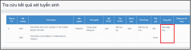 Trạng thái thông tin của thí sinh “Đã nhập học” nghĩa là thí sinh đã xác nhận nhập học thành công và trường Đại học đã nhận được thông tin xác nhận nhập học của thí sinh.